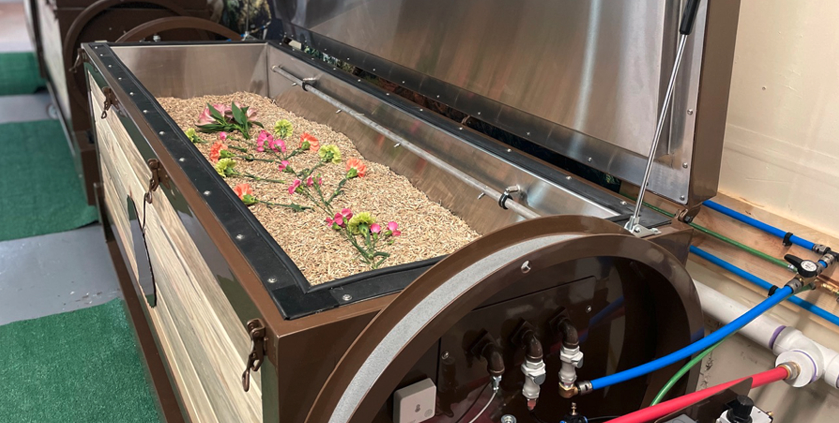 The body is placed in a custom engineered Chrysalis Vessel™ with natural materials like straw, alfalfa, and wood chips. The sealed vessel is monitored for airflow, moisture, and temperature. Families may include funeral notes if provided.